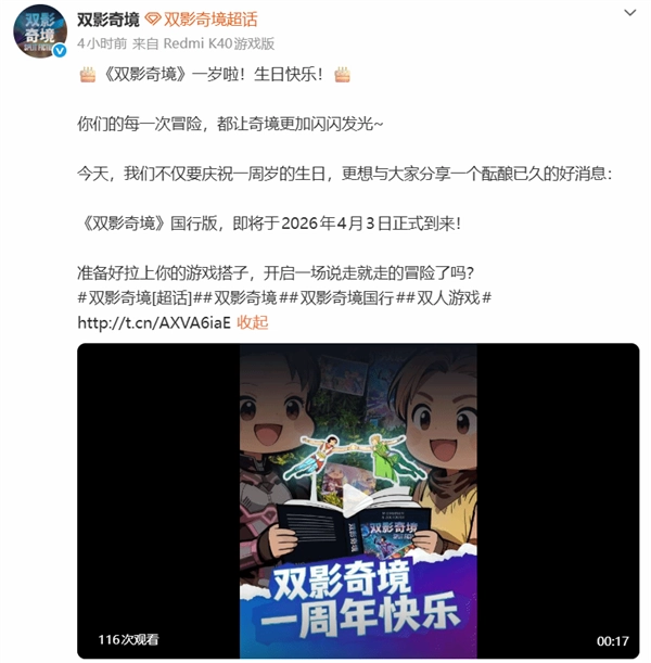 3月6日消息,在《雙影奇境》發(fā)行一周年之時,官方宣布國行版將于4月3日正式上線。
