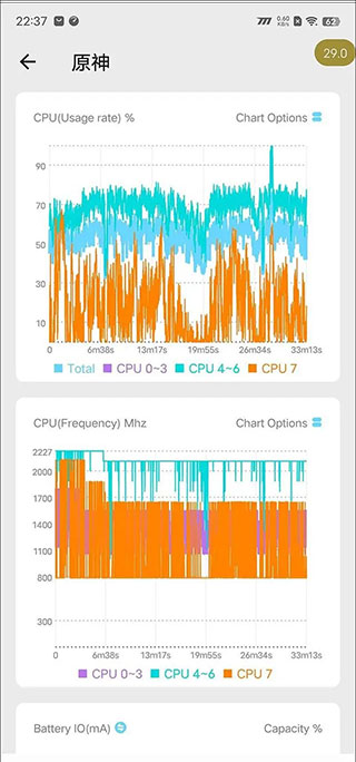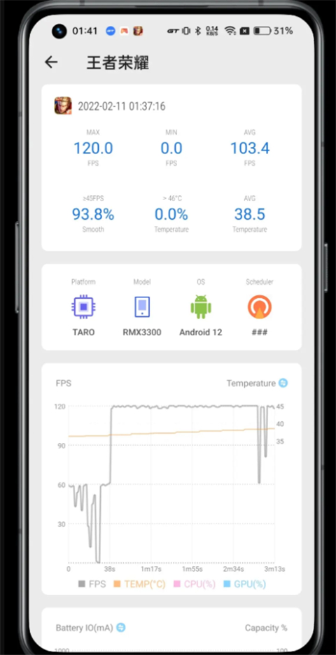 找到《原神》對(duì)應(yīng)的任務(wù),點(diǎn)擊它就能看到豐富的監(jiān)控信息了,包括MAX最大幀率、MIN最小幀率、AVG FPS平均幀率、VARIANCE幀速率差、≥45FPS流暢度、>46℃燙手警告、MAX最高溫度和AVG平均溫度,此外還更直觀的幀率曲線,以及CPU占用率等曲線等。