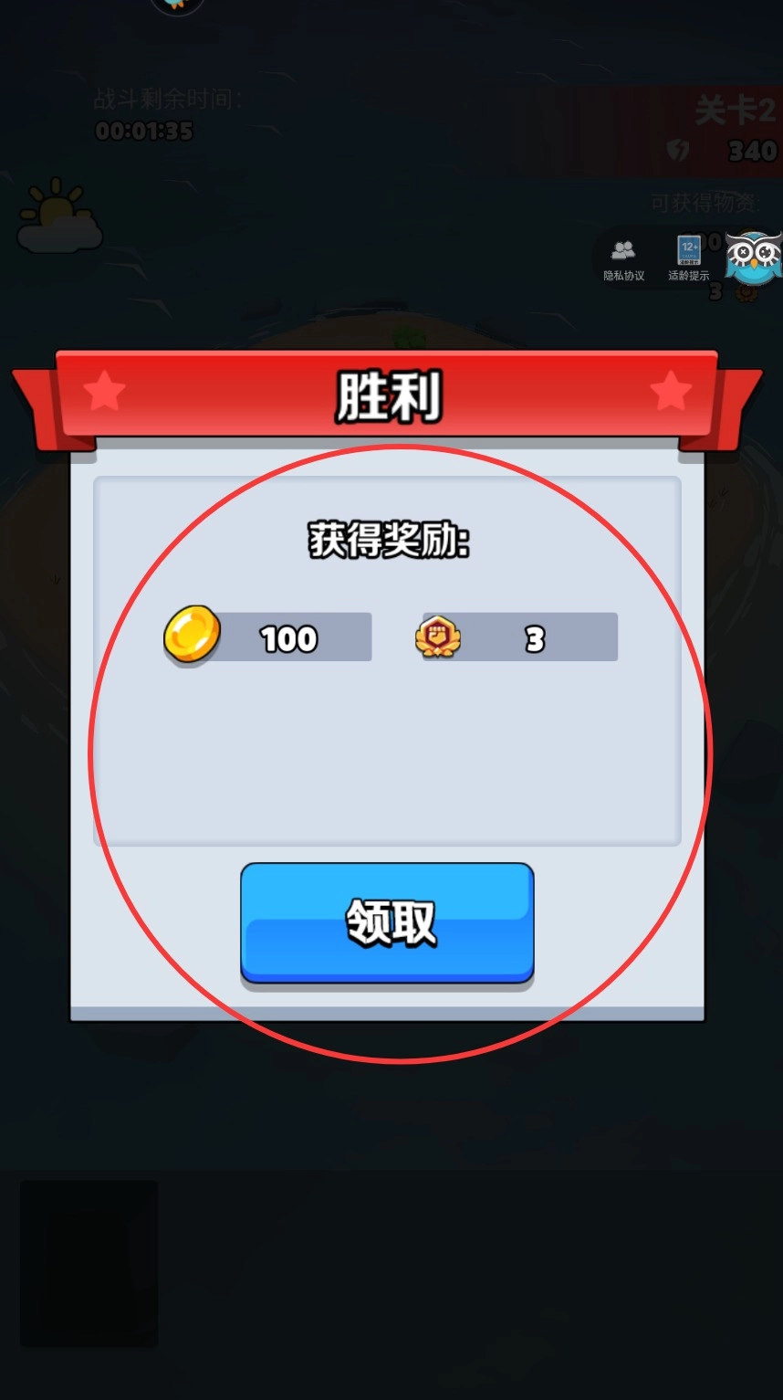 3、只要在規(guī)定時間內(nèi)把所有敵人打敗就能獲勝。戰(zhàn)斗結(jié)束后,會展示出獲得的金幣與勛章數(shù)量,利用這些資源,可繼續(xù)招募更強大的兵種。