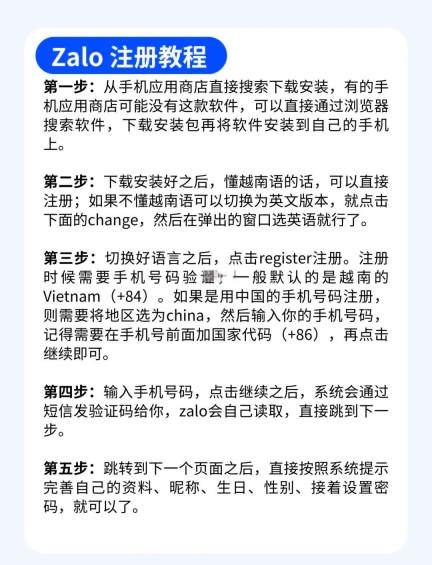 1、安裝:手機應用商店搜Zalo,或瀏覽器搜包再安裝。