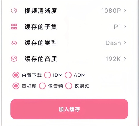 3、點擊解析出來的視頻,選擇緩存視頻,就能自由選擇視頻清晰度,音質等選項。選擇完畢后,點擊“加入緩存”就能完成下載。