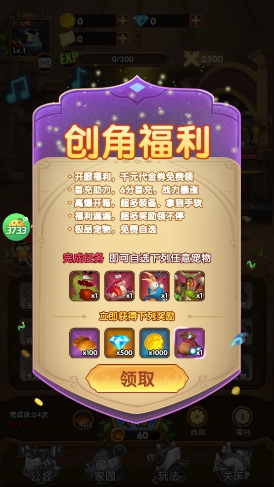 創(chuàng)角即送鉆石、代金券、完成任務(wù)領(lǐng)極品寵物自選。
