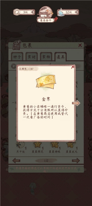 用法:金票可以在黃醬小鋪兌換道具,也可以替代廣告觀看(eg.繁榮、縮短種植時(shí)間等),是很重要的道具(記得不要忘記黃醬小鋪里可以每天看50次廣告領(lǐng)取)