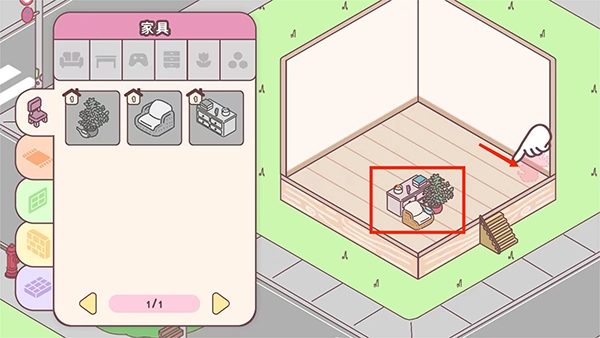 4、進(jìn)入游戲主界面按照提示,拖動盆栽、沙發(fā)和柜子,移動到指定的位置,完成新手任務(wù)后,就是自己來布置這個有愛的小家了,