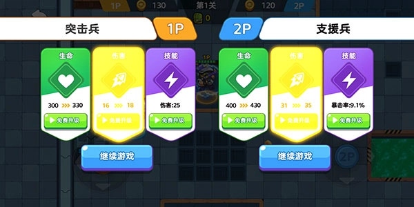 7、當(dāng)消滅完當(dāng)前關(guān)卡的所有敵人后,玩家便能夠升級(jí)自身屬性,從而更好地應(yīng)對(duì)后續(xù)關(guān)卡。在此過程中,同樣需要兩名玩家都完成確認(rèn),才能進(jìn)行下一步操作。