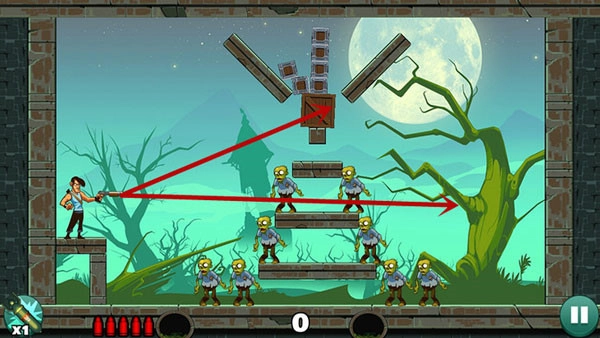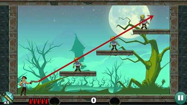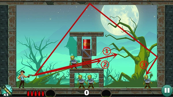 這一關(guān)卡相對(duì)容易。一種方法是,用一發(fā)子彈擊斃上方的僵尸,接著利用子彈反彈消滅右邊的僵尸,而最后一個(gè)僵尸會(huì)直接被木箱子壓死。另外,還能選擇打掉木板,讓子彈從上方反彈下來進(jìn)行攻擊。