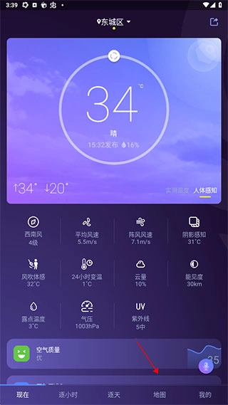 3、選好城市就可以查到當(dāng)前城市的天氣了,風(fēng)速、體感、能見(jiàn)度、云量都可以很清晰的看到;