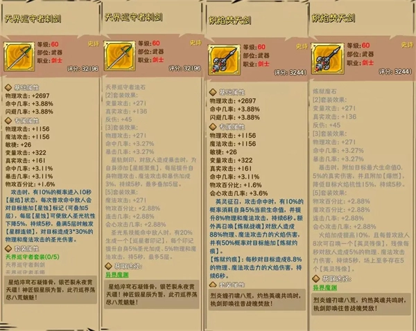 劍士60武器天界套圣光屬性傷害加成,而火劍士不用說(shuō)就是火屬性傷害加成了。