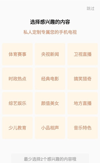 用戶在本站并打開軟件之后就會跳轉到愛好選擇頁面,可以選擇自己喜歡觀看的內(nèi)容,也可以點擊右上角跳過。