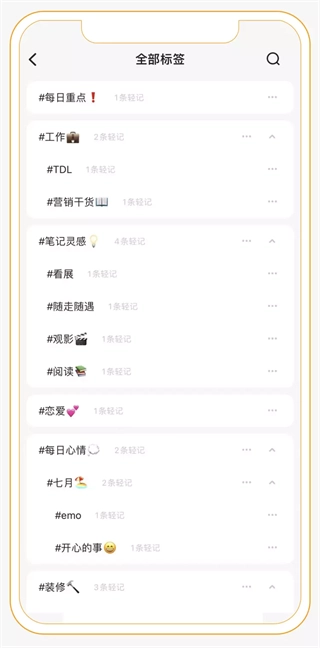 在「輕記」里,運用的是多級標(biāo)簽系統(tǒng)。借助這一系統(tǒng),你不僅能夠在「輕記」中構(gòu)建更為立體的知識體系,還能實現(xiàn)快速檢索,讓操作變得更加便利與高效。它能將碎片化的記錄整合為體系,助你徹底擺脫分類焦慮。