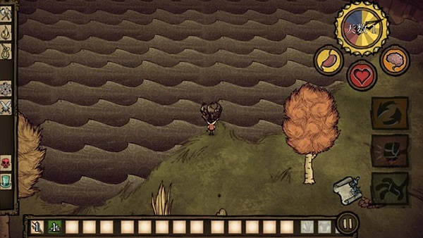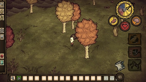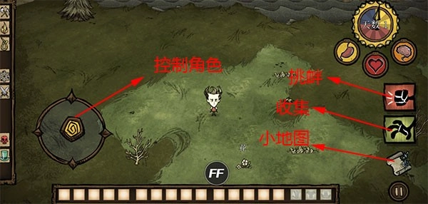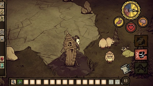 5、游戲正式開啟,屏幕左邊用于控制角色方向,右邊則是負(fù)責(zé)收集相關(guān)操作。玩家得收集所有可利用的資源,以此躲避饑荒。