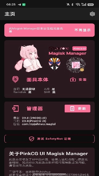 有開發(fā)者依托Magisk框架開發(fā)了一款粉色主題的美化版本工具,這款工具主打個性化管理。它的界面設(shè)計(jì)走的是清新甜美的粉色路線,在保留Magisk核心功能的基礎(chǔ)上,還額外加入了不少便捷實(shí)用的功能模塊和豐富的個性化設(shè)置選項(xiàng)。