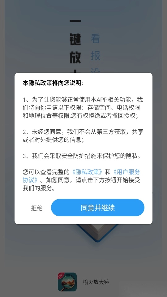1.打開軟件閱讀“隱私政策和用戶服務(wù)協(xié)議”點擊“同意并繼續(xù)”進入