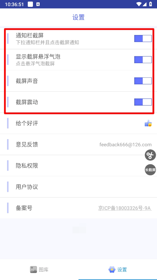 6、最后還可以切換至"設(shè)置"頁面開啟截圖聲音、震動(dòng)等。