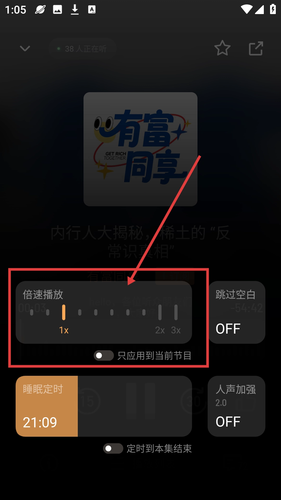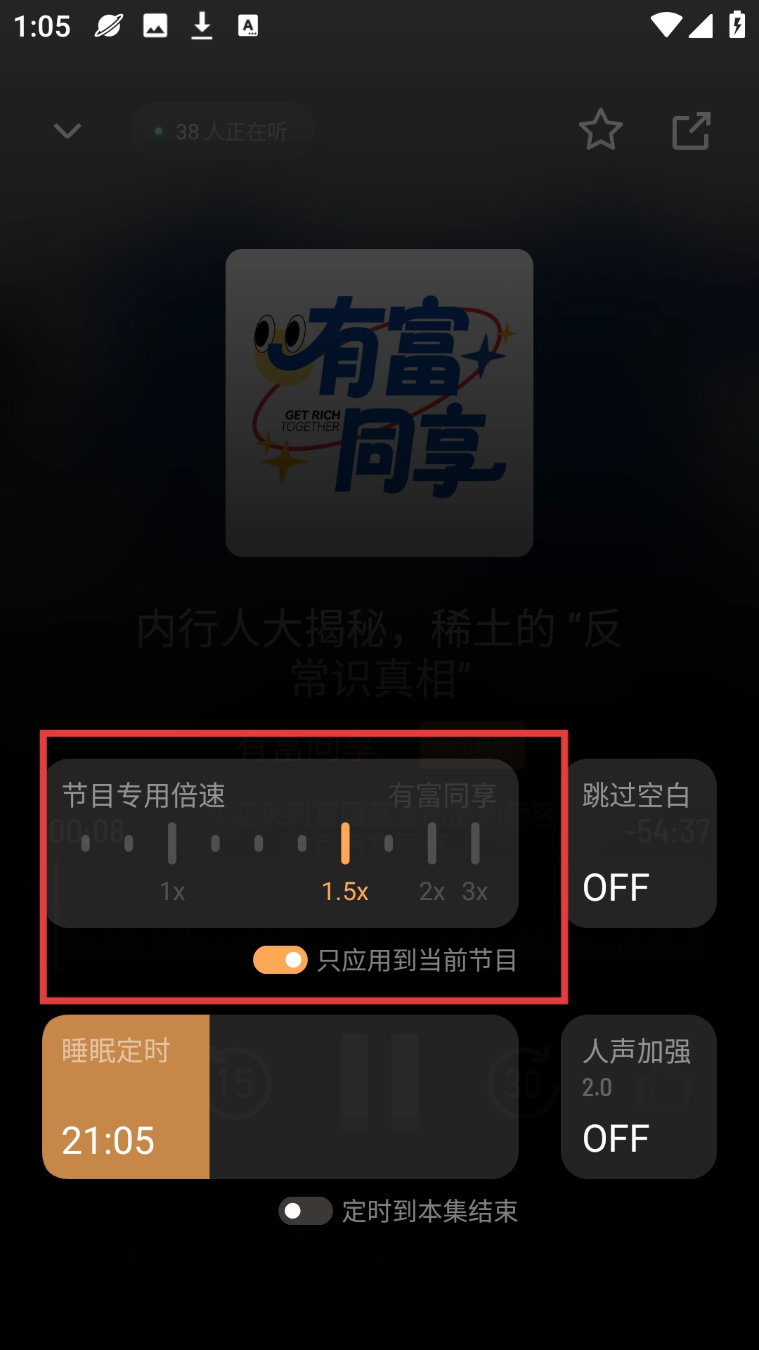 4、選擇合適的倍速,如1.5x,并開啟“只應(yīng)用到當(dāng)前節(jié)目”,即可調(diào)整該播客的播放速度哦。