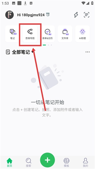 1、在首頁點(diǎn)擊【思維導(dǎo)圖】選項(xiàng),就能進(jìn)入思維導(dǎo)圖編輯頁面,著手創(chuàng)建結(jié)構(gòu)化的筆記內(nèi)容啦。