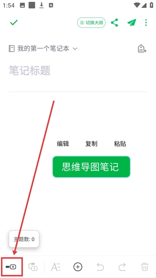 2進(jìn)入思維導(dǎo)圖編輯頁面后,點(diǎn)擊左下角的主題按鈕,就可以添加新的主題節(jié)點(diǎn),用來搭建筆記的結(jié)構(gòu)了。