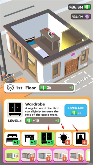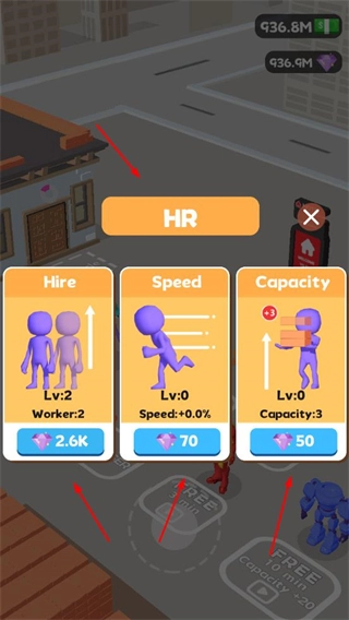 2、雇傭工人并升級其速度、容量等屬性,增強建筑效率,助力房屋建造與經(jīng)營。