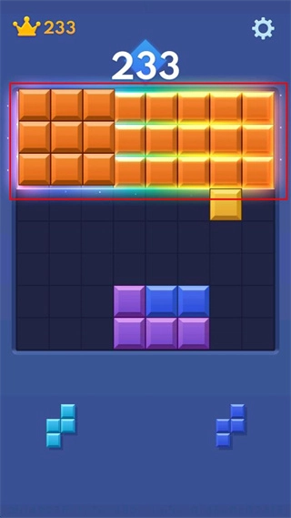 4當分數(shù)達到233且皇冠數(shù)量也為233時,需要處理紅色方框內(nèi)的橙色方塊,將底部的方塊移動過去與它相連,以此觸發(fā)多排消除來獲取更高的分數(shù)。