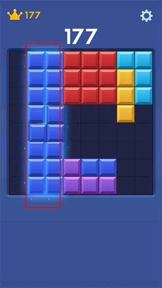 3、當分數(shù)達到177且皇冠數(shù)量為177時,留意左側(cè)紅色方框里的藍色方塊,移動相應(yīng)方塊讓它們連成完整的一片區(qū)域,這樣就能完成消除。