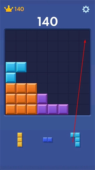 2當分數(shù)和皇冠數(shù)量均達到140時,點擊右側(cè)的藍色方塊并向上移動,將其放置在頂部藍色方塊的旁邊,讓相同顏色的方塊連接在一起。