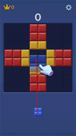 1、把底部的藍色方塊向上移動到中間藍色方塊所在的位置,讓相同顏色的方塊連接在一起從而消除,初始分數(shù)設(shè)定為0,皇冠數(shù)量也是0。