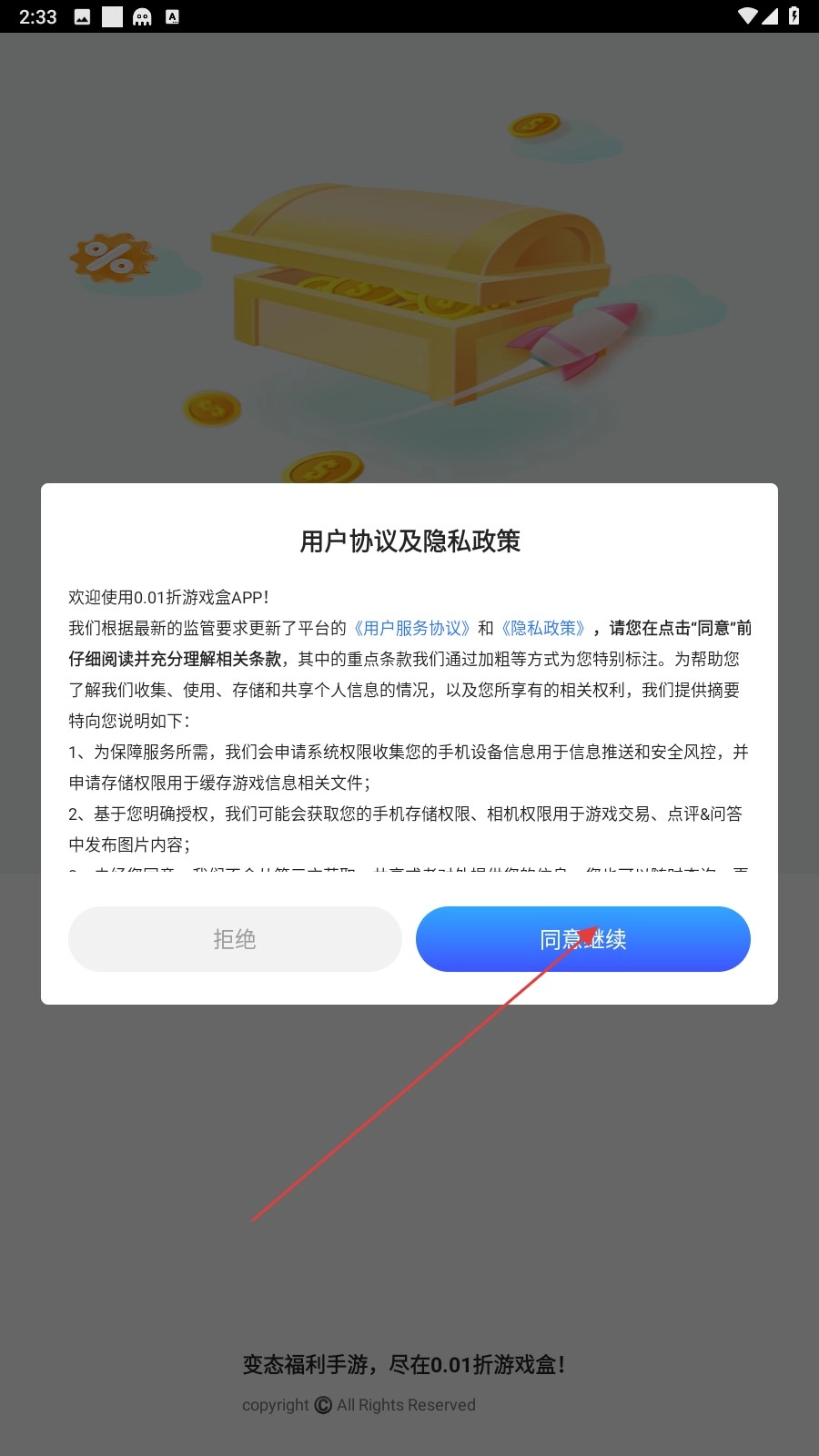 1、首次啟動(dòng)0.01折游戲盒,點(diǎn)擊【同意并繼續(xù)】接受協(xié)議。