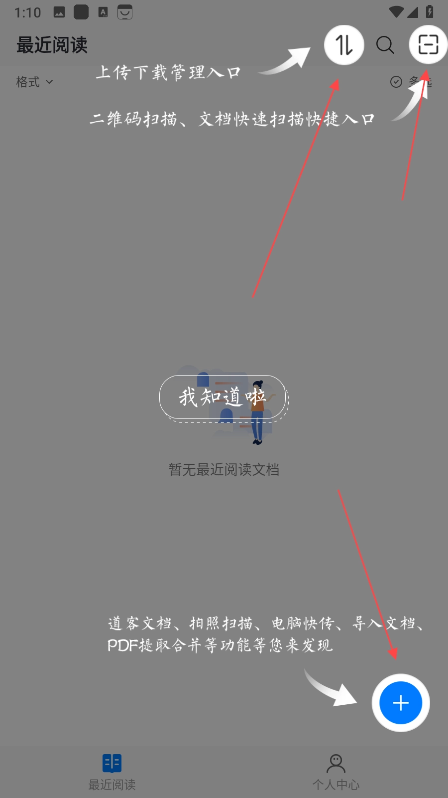 1、打開(kāi)稻殼閱讀器進(jìn)入最近閱讀界面,右上角有上傳管理入口、二維碼掃描與文檔快速掃描入口,點(diǎn)擊底部藍(lán)色加號(hào)按鈕可進(jìn)行道客文檔、拍照掃描、電腦快傳等操作。