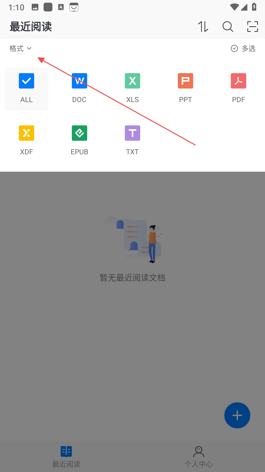 在最近閱讀頁(yè)面點(diǎn)擊格式按鈕,會(huì)展開(kāi)文檔格式篩選選項(xiàng),其中包含ALL、DOC、XLS、PPT等多種格式,根據(jù)需求選擇格式后,就能篩選出對(duì)應(yīng)格式的文檔,便于查找。