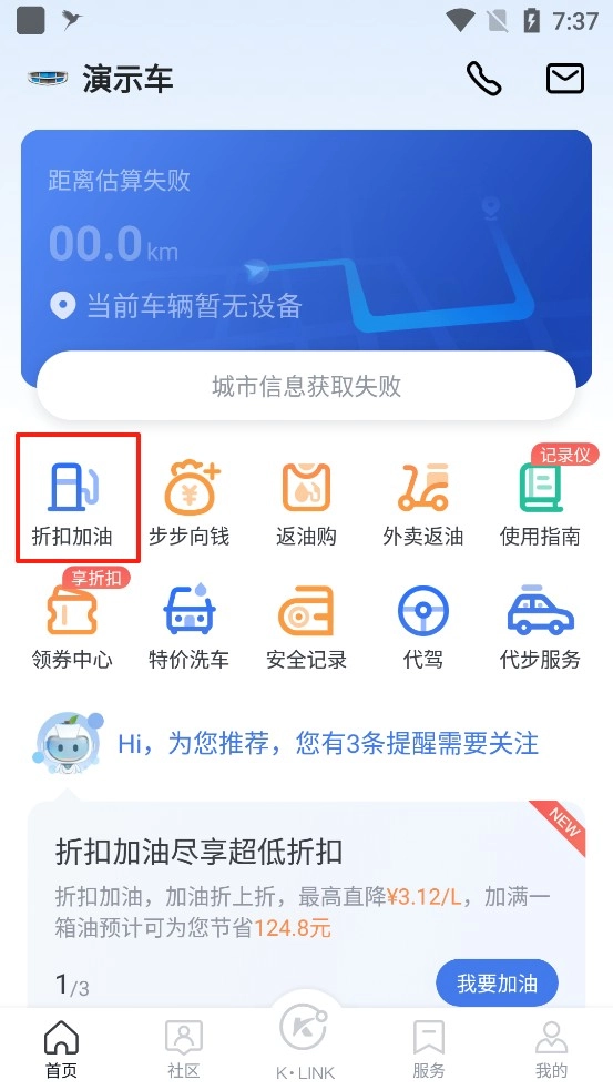 1、打開凱勵程,點擊折扣加油
