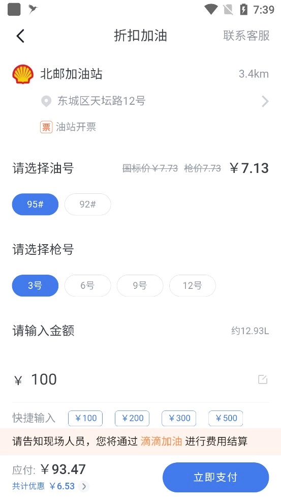3、挑選油號與槍號后輸入金額,若有折扣會顯示出來,接著點擊立即支付