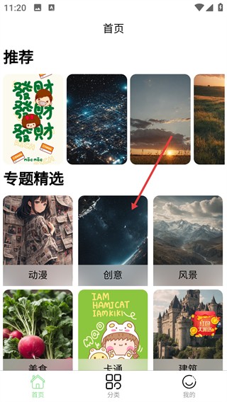 1、在首頁的【專題精選】板塊,挑選目標(biāo)分類(例如【創(chuàng)意】),點擊對應(yīng)的分類卡片,就能進入該分類的內(nèi)容列表頁面。