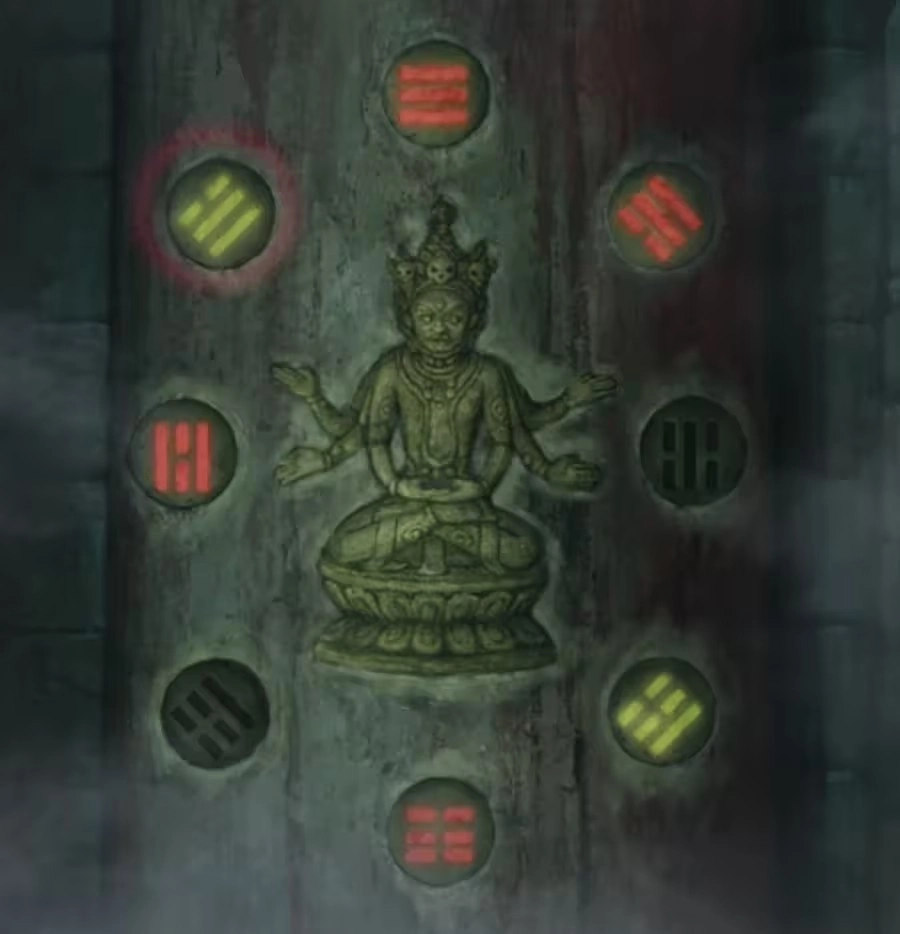 查看左側(cè)的六葬菩薩機(jī)關(guān),按圖示調(diào)整六個線索的顏色,打開棺材后會發(fā)現(xiàn)另一尊木頭六葬雕像。再次將【木簽】插入雕像,即可獲取【一貫古錢】。隨后切換至大地圖,前往【山洞】將【一貫古錢】交給聶莫黎,從而得到【銅錢劍】。接著切換大地圖來到【奉奘祠】,對金屬雕像使用【銅錢劍】——需要注意的是,使用后會觸發(fā)一個手動點(diǎn)擊斷頭的小游戲,體驗(yàn)相當(dāng)暢快!本章至此結(jié)束!