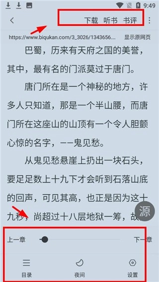 在閱讀時輕觸屏幕中央,就能調(diào)出目錄、開啟聽書功能、緩存章節(jié),還可以切換夜間閱讀模式,進(jìn)行多種個性化設(shè)置。