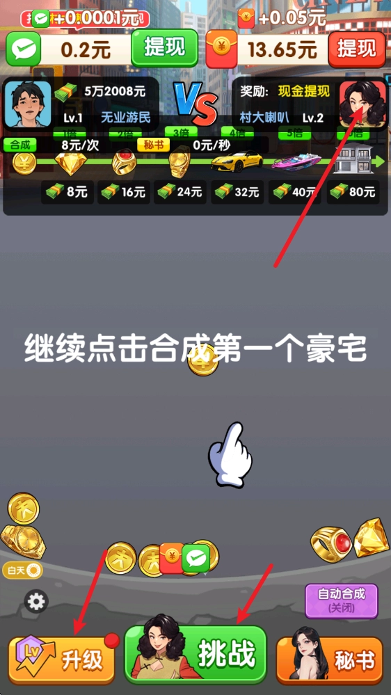 我是首富,這是一款圍繞少年逆襲故事展開的趣味合成小游戲。在游戲里,你將化身為一位沒有工作的失意青年,因一次意外的機遇得到了一個可以無限升級的系統(tǒng)。借助合成玩法持續(xù)積累財富,以此提升等級,助你完成從無業(yè)游民到成功人士的精彩蛻變!并且在升級的過程中,還能收獲大量豐厚的獎勵呢!