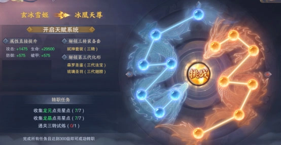 二轉(zhuǎn)之后會化身為玄冰雪姬,普通攻擊的傷害增加20%;同時會新增職業(yè)專屬的被動技能,還會額外增加一個技能孔位;并且能夠解鎖新的裝備欄;此外,新的翅膀和法寶化形功能也將開放。