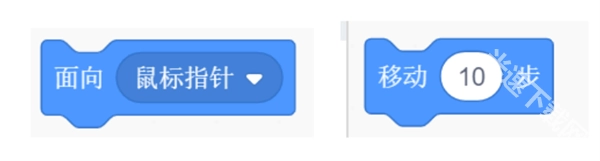 怎樣達(dá)成貓捉老鼠的功能呢?能夠運(yùn)用運(yùn)動模塊里的這兩個模塊來完成。