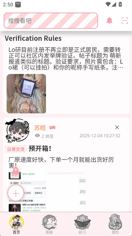 lo研社也就是洛研社,是專門為洛麗塔服飾和文化愛好者打造的小眾興趣類應(yīng)用。它的底部設(shè)有首頁、圖鑒、研習(xí)和我的這幾個(gè)板塊,頂部則有上新日歷、合集、共享黑名單以及排行榜功能。在lo研社里,愛好者們可以第一時(shí)間獲取新款小裙子的上新信息,瀏覽各種風(fēng)格的服飾圖鑒,還能和其他同好分享穿搭返圖以及種草心得。不過需要注意的是,現(xiàn)在注冊lo研社后不會立即成為正式居民,得經(jīng)過轉(zhuǎn)正才能在社區(qū)內(nèi)發(fā)布舉牌驗(yàn)證內(nèi)容哦。