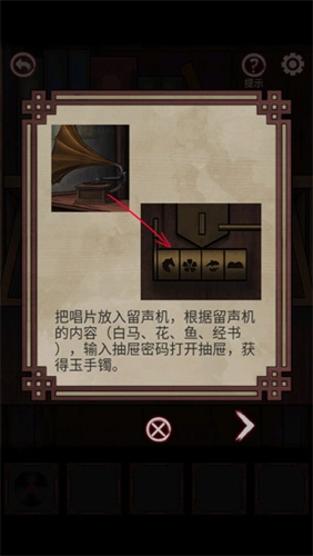 將唱片放入留聲機(jī),根據(jù)提示打開(kāi)抽屜,獲得玉手鐲;
