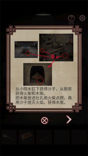 首先取下水缸底下的沙子,接著走進(jìn)右側(cè)的房子,在里面找到勺子、火柴和木頭,再按照提示操作獲取木炭。