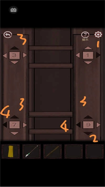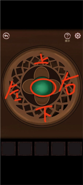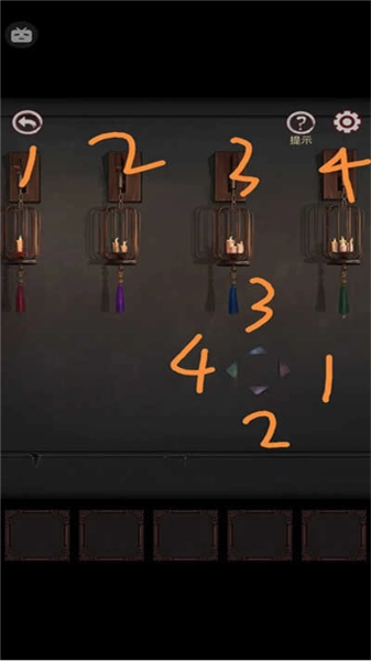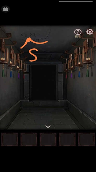 回到之前的走廊,右側(cè)的墻壁上掛著紅燈籠,里面有1根蠟燭;紫燈籠里有2根,藍(lán)燈籠3根,綠燈籠4根。旁邊的提示信息是:向右對(duì)應(yīng)紅燈籠1根蠟燭,向下對(duì)應(yīng)紫燈籠2根,向左對(duì)應(yīng)綠燈籠4根,向上對(duì)應(yīng)藍(lán)燈籠3根。