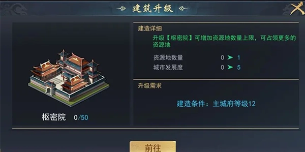 主城等級達(dá)到12級時可建造樞密院,該建筑決定了可占領(lǐng)資源地的數(shù)量;樞密院的等級越高,能夠占領(lǐng)的資源地數(shù)量也就越多。