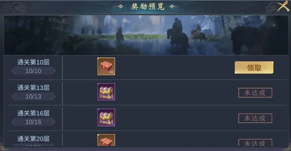 每成功挑戰(zhàn)一層,主公都能獲取首次通關(guān)的獎勵,若挑戰(zhàn)失敗就需重新嘗試。當(dāng)達(dá)到第3層或者第4層時,還能領(lǐng)取一份對應(yīng)征戰(zhàn)層數(shù)的獎勵。