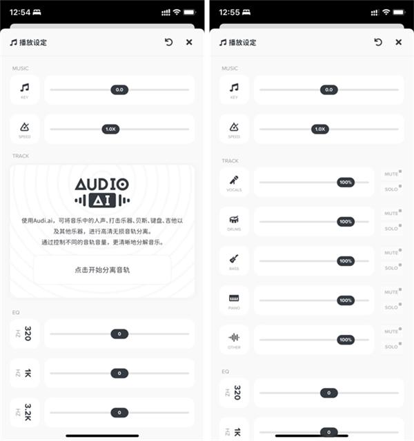 若要分離當(dāng)前播放的音樂,需點(diǎn)擊界面右上方的「播放設(shè)定」選項。進(jìn)入后,在「TRACK」板塊中能找到「AUDIO AI」功能,借助人工智能技術(shù),該功能可更高效地實(shí)現(xiàn)樂器音軌的分離操作。點(diǎn)擊啟用此功能后,系統(tǒng)會將音頻文件上傳至云端進(jìn)行智能分析,待分析完成,生成的多軌音頻會回傳至本地,從而完成音軌分離流程。