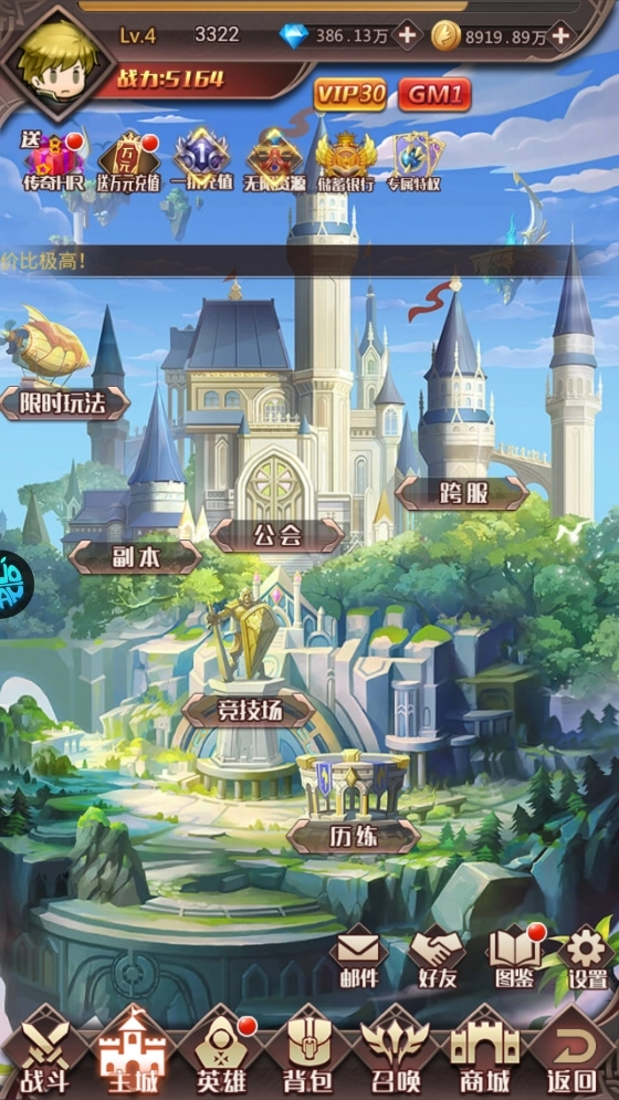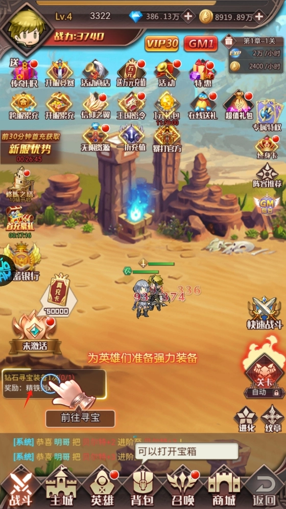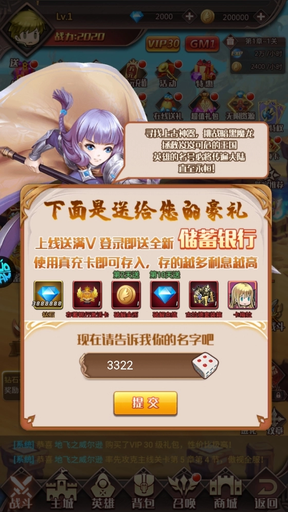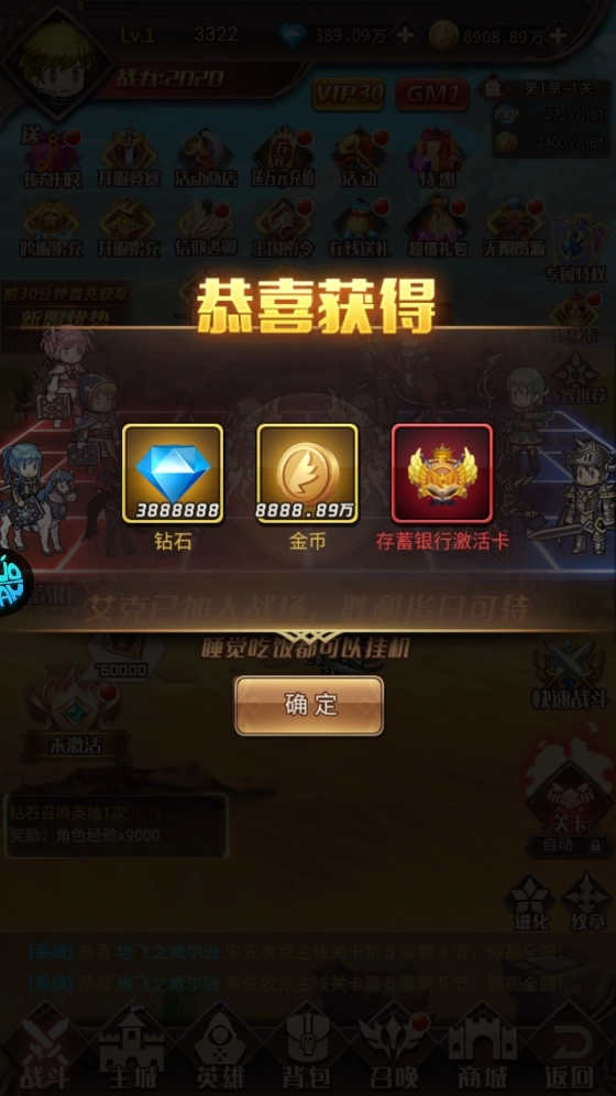 開局即送:VIP30、存蓄銀行激活卡*1、388萬鉆石;