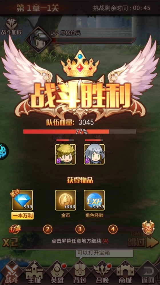 戰(zhàn)斗獲勝后,你將得到各種各樣的物品獎(jiǎng)勵(lì),這些資源能夠用來培養(yǎng)英雄,幫助你增強(qiáng)戰(zhàn)力去對(duì)抗暗黑魔龍。