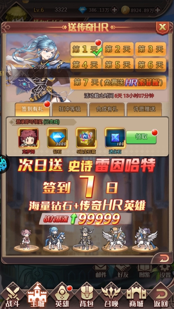 每天完成簽到就能領(lǐng)取豐富獎(jiǎng)勵(lì),連續(xù)簽到滿7天還能獲得大量鉆石和傳奇HR英雄,助力你的冒險(xiǎn)之旅更加順利。