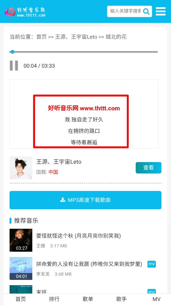 支持在線試聽歌曲,查看歌詞,隨時在線聽歌,享受便捷的音樂體驗。