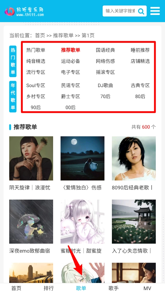 進入歌單板塊,可以根據(jù)分類選擇喜歡的歌曲暢聽。