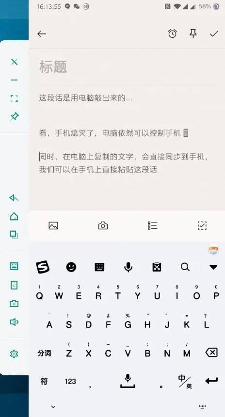 點(diǎn)擊“息屏”按鈕后,手機(jī)屏幕會(huì)隨即熄滅,不過電腦端顯示的依舊是手機(jī)界面,如此一來,只要其他人不查看我們的電腦屏幕就行。另外,在電腦上復(fù)制的文字,會(huì)直接同步到手機(jī)上。